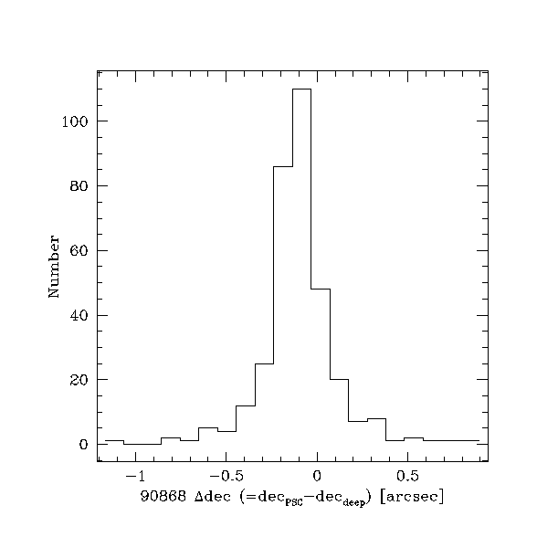 | Figure 9 - Declination residuals (PSC-deep) plotted versus declination. | Figure 10 - Declination residuals (PSC-deep) plotted versus Right Ascension. | Figure 11 - Histogram of Declination residual (PSC-deep). |