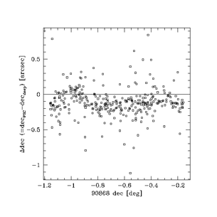 The largest remaining astrometric residuals occur in the combined calibration image and source lists from the 90004 field, as shown in Figure 17 below. Because of the large "raw" astrometric offsets with respect to the All-Sky PSC in this field, many of the positional correlations between the individual scan extractions that were needed to measure the offsets were missed. This resulted in an undercorrection of the mean offsets.