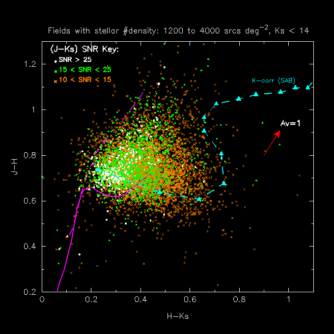 Figure 4 is the color-color distribution for extended sources located within low stellar confusion fields, <1200 stars deg-2 brighter than mag=14 at Ks. The galaxy color-color is demarked by symbols coded according to the J-Ks SNR. The solid lines denote the main sequence locus (giants diverge at large J-H). The dashed line and triangle points denote the K-correction curve for a spiral galaxy (no evolution), where each triangle represents 0.1 in redshift (z).