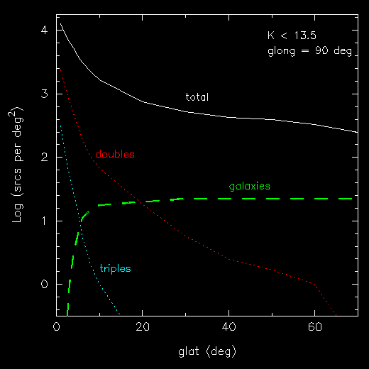 Figure 7 shows the expected number of double and triple stars (dotted lines) with galactic latitude. For comparison, the total number of stars (solid line) and the expected number of field galaxies (dashed line) are given. The longitude is fixed at 90°. The calculations are based on the starcount models of Jarrett (1992, PhD Thesis, UMass). Double stars, dominated by sky-projected associations, represent primary-secondary separations < 6´´ (the 2MASS PSF, for comparison, has a FWHM > 2´´). The galaxy counts are based on 2MASS data.