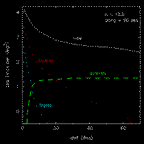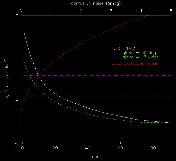 Figure 8 shows the predicted stellar number density, log [stars per deg2] brighter than mag=14 at Ks, as a function of galactic latitude. Two sets of solutions are shown, that of 50° galactic longitude (solid line) and 130° galactic longitude (dashed line). The dashed lines define regions of low (< 3.1), moderate (3.1 to 3.6) and high (> 3.6) stellar number density. The estimated confusion noise (Dmag) as a function of the stellar number density is denoted by the dot-dashed line, assuming index a = 1, outlier cutoff q=5s, and the beam size is 5´´.