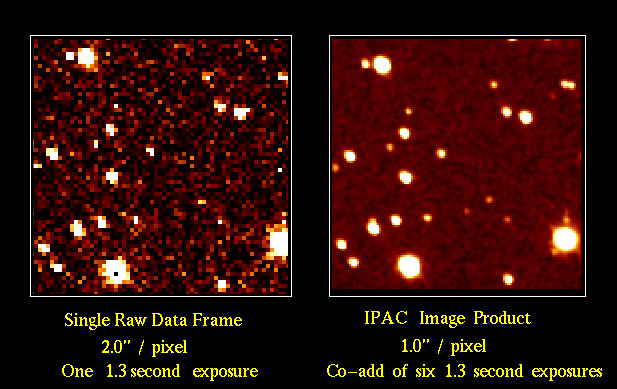 The camera field-of-view shifts by approximately one-sixth of a frame in declination from frame-to-frame. Figure 1 illustrates the relationship between individual camera frames and survey tiles. The camera images each point on the sky six times for a total integration time of 7.8 sec. The scan rate (and, thus, the frame-to-frame declination offset) and array orientation are set, so that each of the six apparitions of a given star occur at a different location relative to a pixel center. This sub-pixel "dithering" improves the ultimate spatial resolution of the final coadded Atlas Images relative to a single undersampled image taken with 2.0" pixels. Figure 2 compares a single survey frame with the final Atlas Image product.
