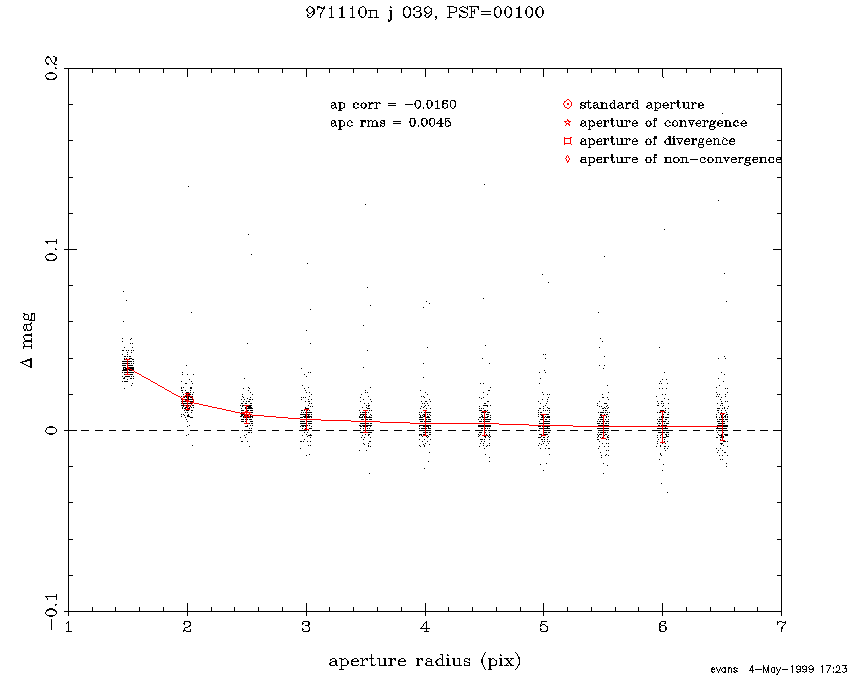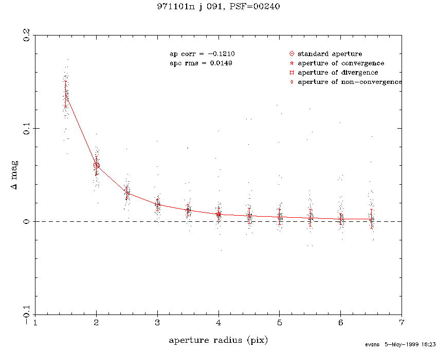 J-band curves-of-growth evaluated during periods of good (2.5" FWHM) and bad (3.4" FWHM) seeing in scans from the First Incremental Data Release are shown in Figure 2 and Figure 3, respectively. The x-axes show aperture radius in pixels (2"/pixel), and the y-axes show the difference between successive aperture magnitudes plotted versus the outer radius. Indicated on the figures are the radius of the "standard aperture" (open circle), and the radius at which the curve-of-growth was determined to converge (open star). The good seeing case shown in Figure 2, converges at a smaller radius, 2.5 pix, than the poor seeing case, 4.0 pix. The curve-of-growth correction determined in these examples were -0.016+0.005 mags and -0.121+0.015 mags, respectively.
