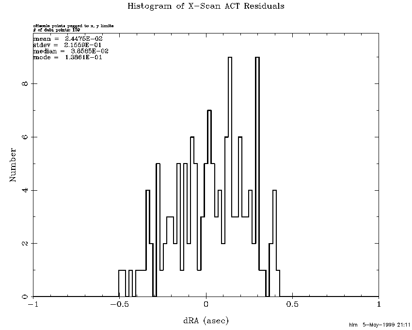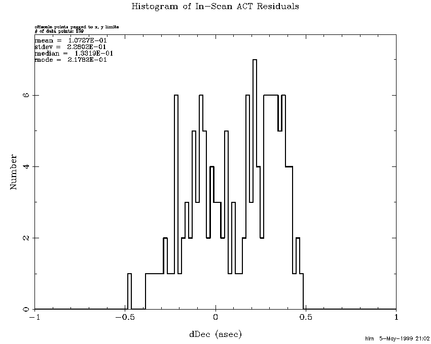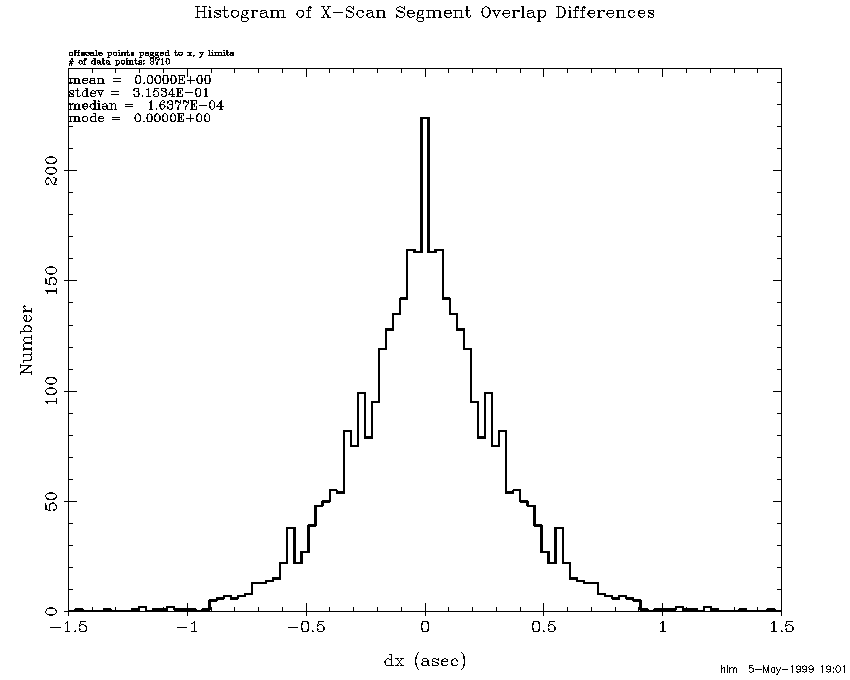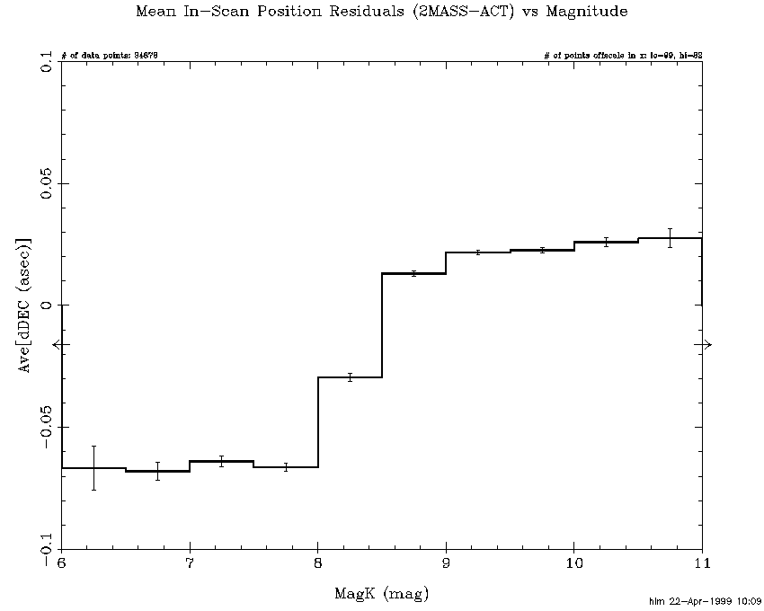 The fact that 2MASS positions closely match the ACT positions does not by itself guarantee that all is well. One would expect position errors to grow between ACT stars due to random walk. Position differences within scan overlaps reveal how consistent the reconstructions are. Overlap consistency combined with ACT consistency makes a very strong case. Although each step of a "random walk" is, of course, random the resulting error can grow systematically for long periods. In order to track these deviations, each scan was broken down into 1/2 degree Dec segments and average overlap position differences were computed for each segment. Figure 6 histograms cross-scan segment differences for the entire release and Figure 7 histograms the corresponding in-scan differences. Note that the cross-scan sigma is 0.16 asec which with the square-root of 2 correction reduces to 0.12 asec. The corresponding numbers of the in-scan overlaps are 0.19 and 0.13 asec. It is obvious from these histograms that the tails are longer than those of a Gaussian distribution. The long tails are primarily the result of long periods without ACT stars. Figure 8 and Figure 9 repeat the same plots for only the 86 scans without ACT reconstructions. After the square-root of 2 correction the cross-scan and in-scan sigmas are 0.22 and 0.25 asec, which are very consistent with the ACT residuals for these scans.