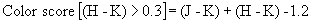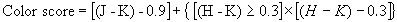which adds the color ‘distance’ (to within a scaling factor) from the dotted line in Figure 20. For sources with (H-K)>0.3, the color score reduces to: