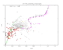 Figure 5 shows the JHKs color-color diagram for the 2MASS Sampler Extended Source Catalog. The black points show extended sources that are found in the Sampler. For informational purposes only, red triangles indicate double stars, and red crosses indicate triple stars. The multiple stars are not included in the Extended Source Catalog. The green lines show the Bessell & Brett (1988) dwarf and giant star tracks. Also overlaid on the plot are the K-correction curves for SAB (magenta) and elliptical (grey) galaxies. The tickmarks on those curves indicate increments of 0.1 in redshift, starting at z=0 on the left. The dashed diagonal blue line indicates how a color criterion can be applied to discriminate between galaxies and multiple stars.