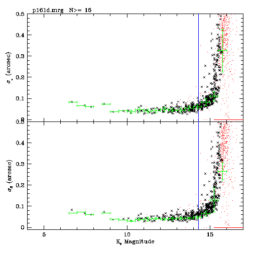 The internal RA (top) and DEC (bottom) positional repeatability of all sources in the P161-D calibration field are shown in Figure 7 versus Ks magnitude. As in Figure 4, the black crosses denote sources detected at least 16 out of the 18 times the field was scanned, red points indicate sources detected less than 16 times, and the green bars show the average positional RMS in 0.5-mag bins. The full scale in each panel is 0.5". One can see that the internal positional consistency is outstanding.