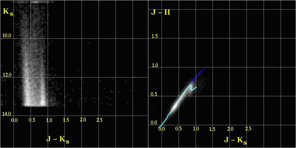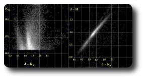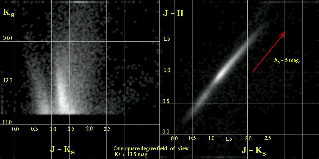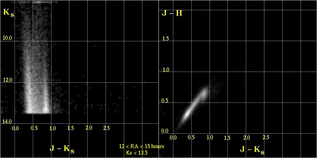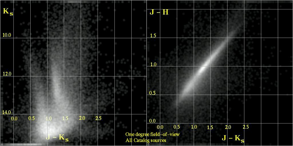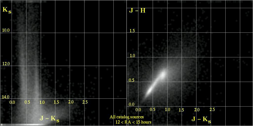 The frames below illustrate the two extreme 2MASS environments -- the Galactic plane and the Galactic pole -- including color-color and color-magnitude diagrams for both environments.