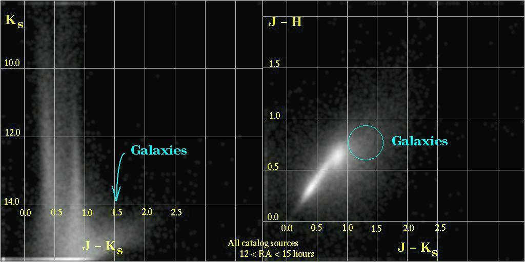Galaxies have unique colors relative to stars in the 2MASS wavelength bands owing to the effects of internal extinction and star formation. The k-correction due to cosmological redshift enhances this color separation from the locus of ordinary stars (and even enables the extraction of relatively accurate photometric redshifts for dense clusters). A J-H vs. J-Ks color-color plot of faint point sources (the high-latitude plot discussed above for the 12 hour to 15 hour range for the complete first release dataset) shows the galaxies as a separate population. This color difference is enhanced by reddening in the Galactic plane, where the light from galaxies must traverse the entire extent of the Milky Way disk. The 2MASS extended source catalog includes a "g"-flag, which includes color in an assessment of whether an extended source is likely to be a galaxy.