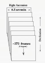 The camera field-of-view shifts by approximately one-sixth of a frame in declination from frame-to-frame. Figure 1 illustrates the relationship between individual camera frames and survey tiles. The camera images each point on the sky six times for a total integration time of 7.8 sec. The scan rate (and, thus, the frame-to-frame declination offset) and array orientation are set, so that each of the six apparitions of a given star occur at a different location relative to a pixel center. This sub-pixel "dithering" improves the ultimate spatial resolution of the final coadded Atlas Images relative to a single undersampled image taken with 2.0´´ pixels. Figure 2 compares a single survey frame with the final Atlas Image product.
