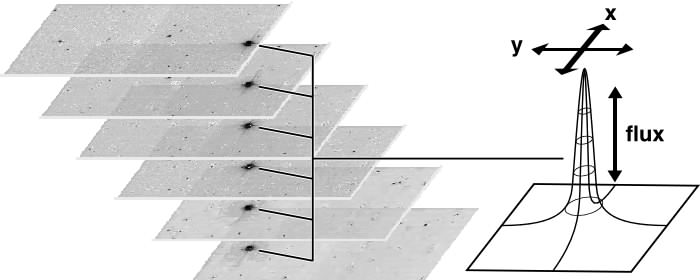 The primary photometry and position estimation algorithm for each candidate detection from the Atlas Images is point source profile-fitting. This provides the most robust estimation for faint sources and objects in denser or more complex environments. Although the detection is done on the coadded Atlas Images, the point source fit is performed directly on the flat-fielded pixel values in a stack of 6 frames, using knowledge of the PSF shape and the relative position offsets for the frames. The latter have already been determined during the Atlas Image generation (cf. IV.3). This is illustrated in Figure 1; the position and amplitude of the source profile is determined during the fitting procedure, but the relative positions of the frames in the stack are held fixed.
