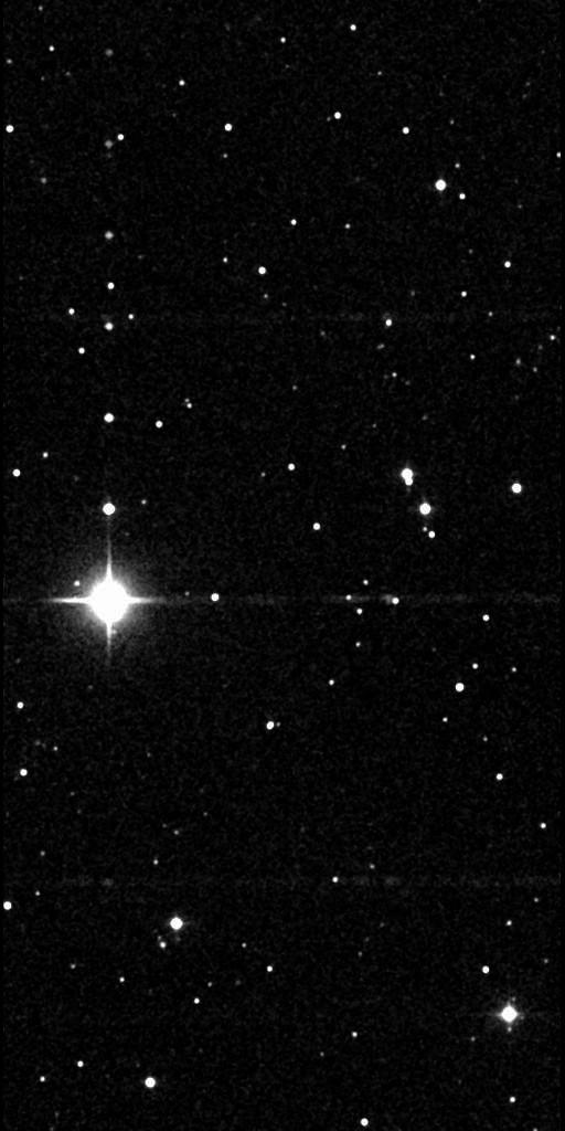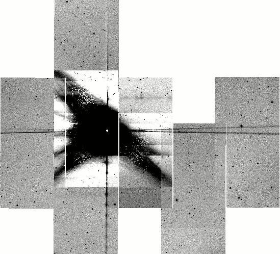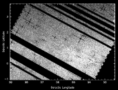 Horizontal "stripe" artifacts extend in the east-west direction at the declination of very bright stars, as well as at 256´´ north and south of the stars position. They extend the width of a scan, and they are probably some form of electronic residual of the bright star. These stripes are much fainter than diffraction spikes.