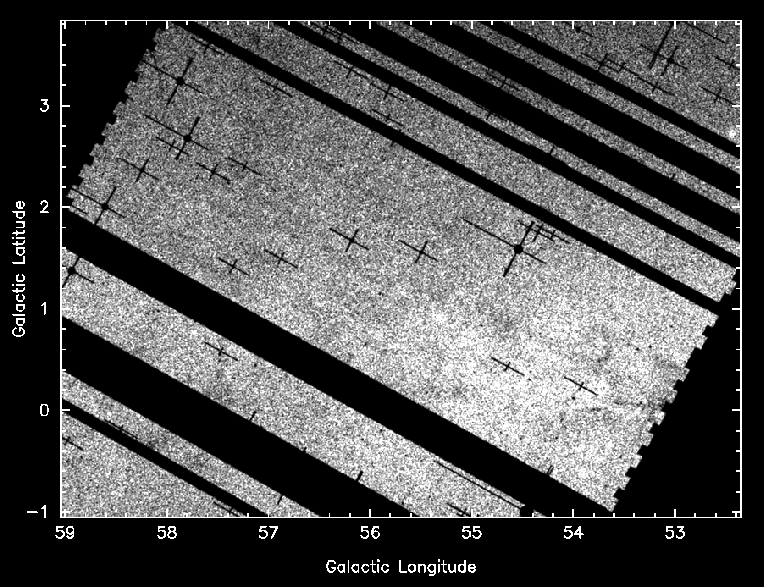 Figure 4 is a source density plot from the PSC near the Galactic plane for Ks < 14.5 mags. The sources removed because of conservative artifact blanking from the very bright stars produce an obvious "mask".