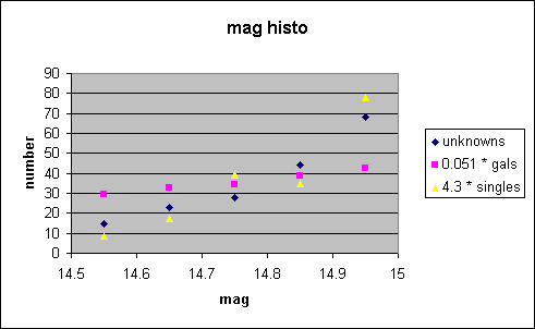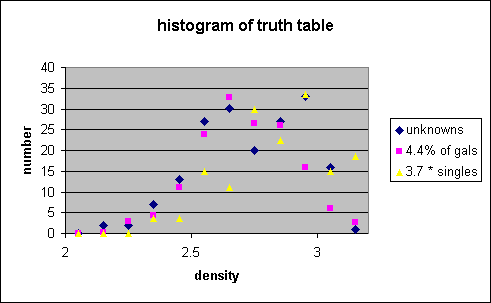 The histogram of unknowns vs. density is almost an exact match of the histogram of galaxies vs. density below density = 2.9, and definitely disagrees with the histogram of singles vs. density below density = 2.9. This is the most powerful evidence that most of the unknowns are, in fact, true galaxies.