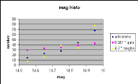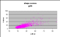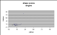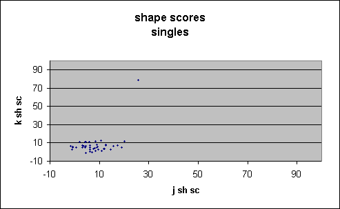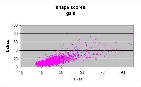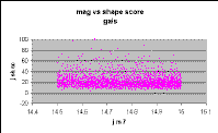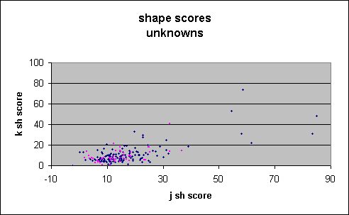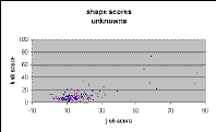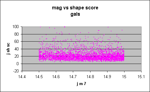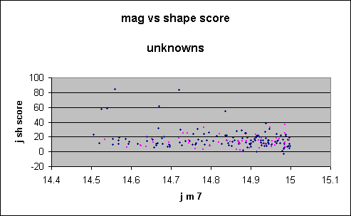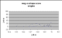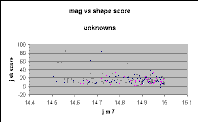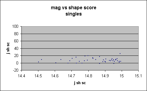 Figure 2 showing unknowns is exactly that predicted from the plot for galaxies, shown in Figure 3, and very different from the plot for singles, shown in Figure 4. Only one single has a j_sh_sc above 20, whereas a considerable number of the unknowns have scores above 20. Further, the unknowns show a clear trend of declining score with fainter magnitude, not present in the singles.