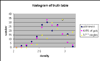 Because we do not have readily available the area covered by this subset of the truth table, we instead simply compare the histogram of number of sources vs. density in Figure 1. (Density is the log number of sources with Ks < 14.0 mag.)