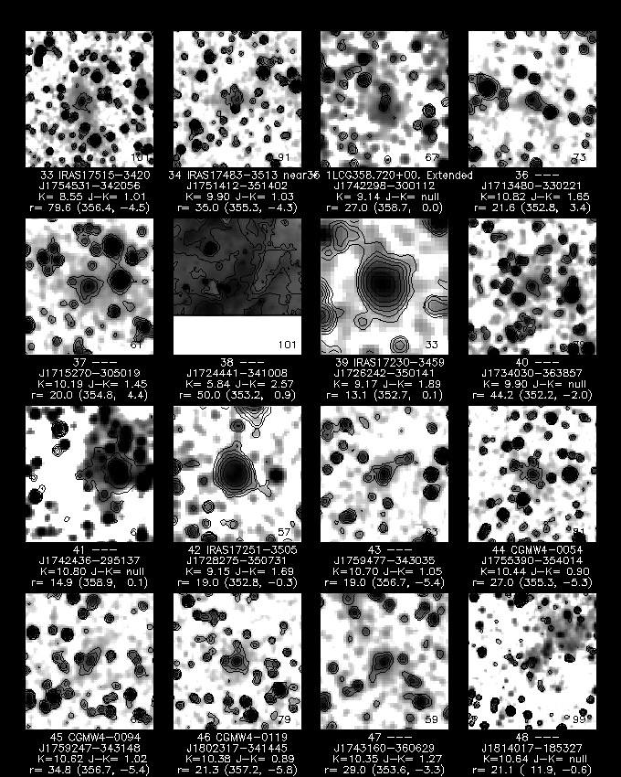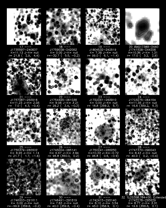 Although the total number of "candidates" in the GC is large (~17,000) it represents a finite number that can be viewed with interactive tools. We designed these tools to display the postage stamp image of the object in three ways: J-band grey-scale, Ks-band grey-scale, and JHKs three-color composite. The three-color image is by far the most powerful way of viewing the images. With visual examination and followup with NED and SIMBAD, we classified each object as either (1) false (triple+ star), (2) extended, or (3) unknown. (note: the DSS is useless in the GC, due to severe extinction). This process took over four weeks of dedicated examination (re: sore eyeballs). Caveat: As with any "expert"-type of classification scheme, the risk of imparting a bias is always present. On the other hand, multiple stars (doubles, triples, ... , etc) are very easy to identify with the human "eye". It is the lower surface brightness fuzzballs that are difficult to identify (hence, we liberally use the "unknown" classification when stumped). Also, we usually call an object "unknown" or equivalently, "other", if it is a piece of a real extended object (e.g., some outer part of a large galaxy; nebulosity; HII regions; etc).