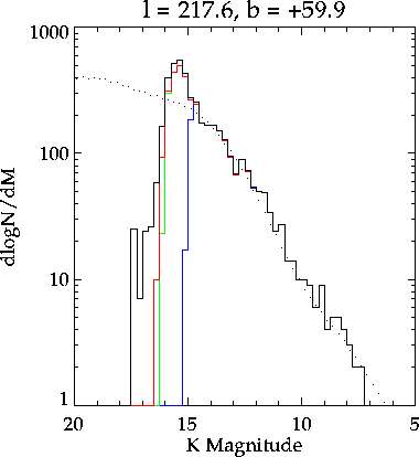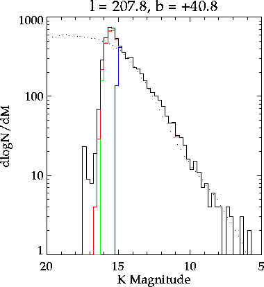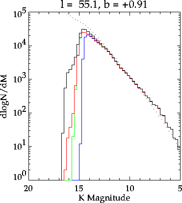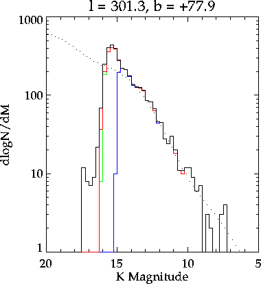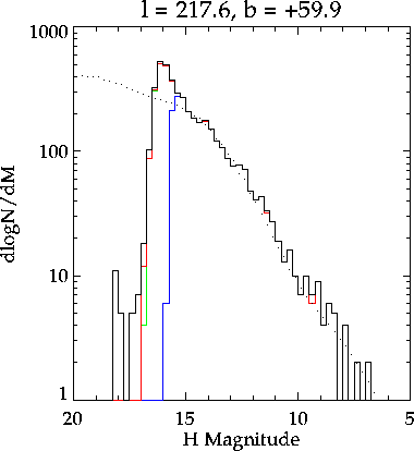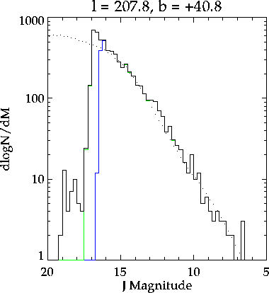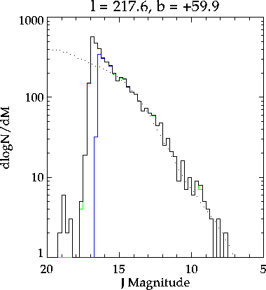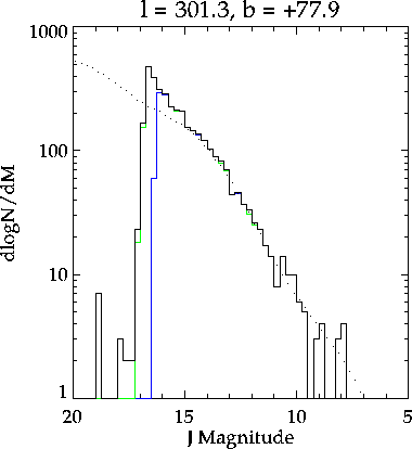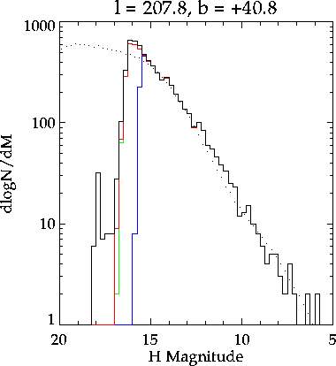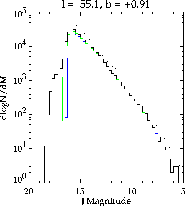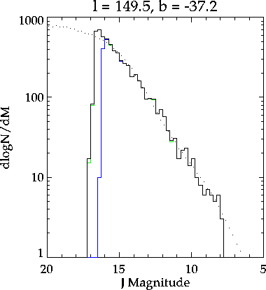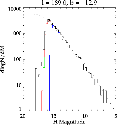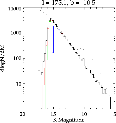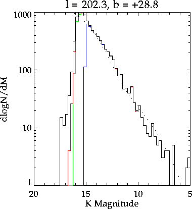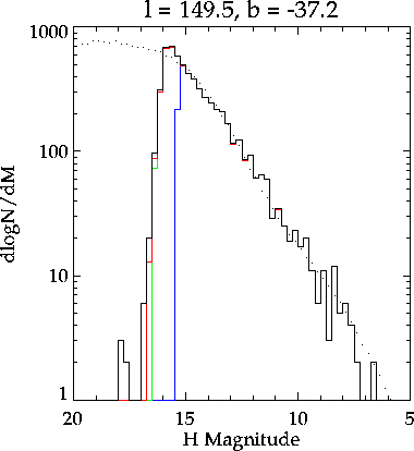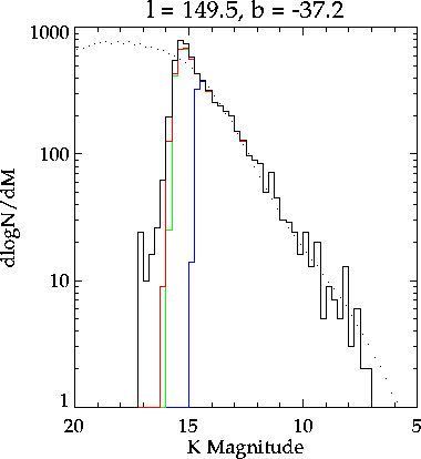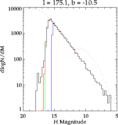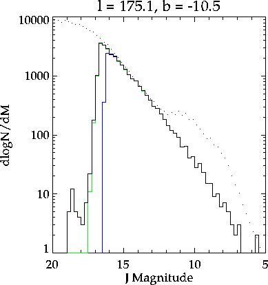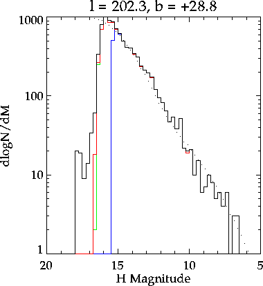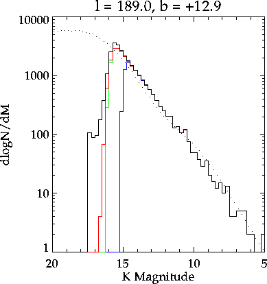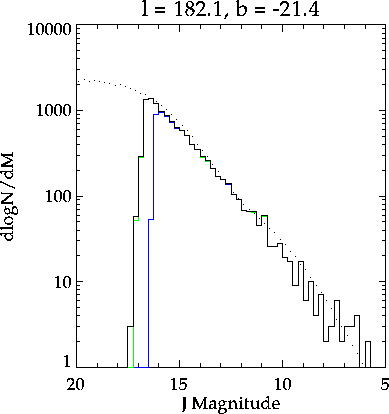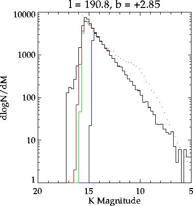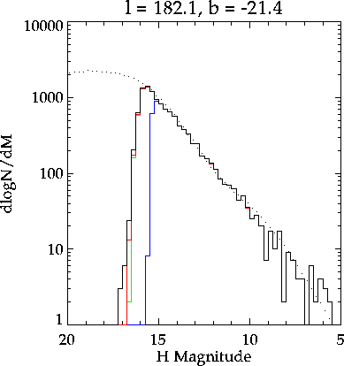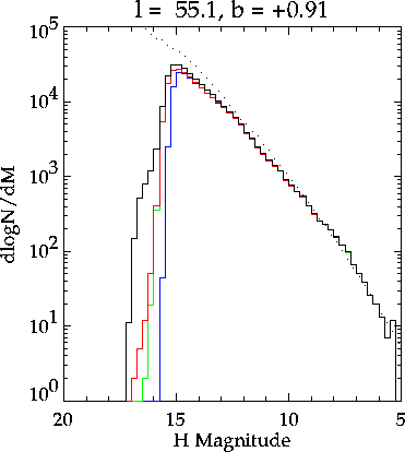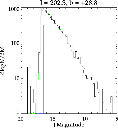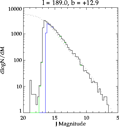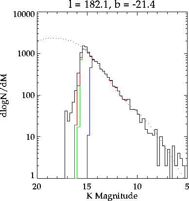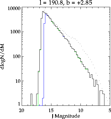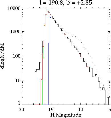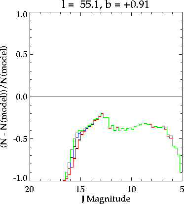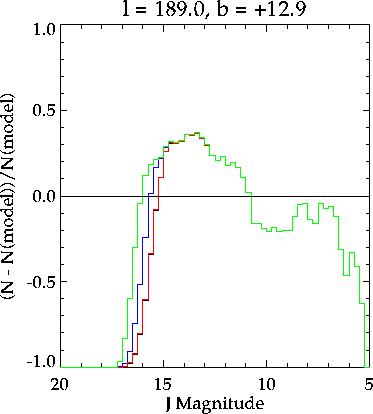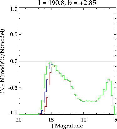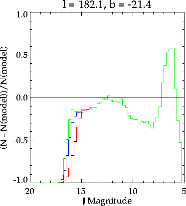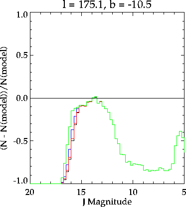 Close to the Galactic plane, we see that the results are not quite as good. In the anti-center direction, there is a source count enhancement predicted by the model at magnitudes brighter than ~12 in all bands, which is not matched by Catalog sources counts, which appear to follow a single power law from magnitude 7 to 15. M. Cohen has noted that the source counts toward the anticenter are sharply different between the optical, near-IR and mid-IR. The cause of this discrepancy may have its basis in which source counts (optical, NIR, or MIR) are the basis of the dominant model component in this direction.