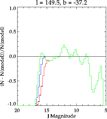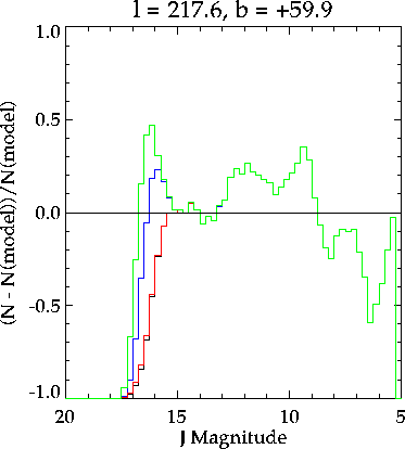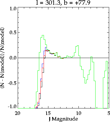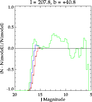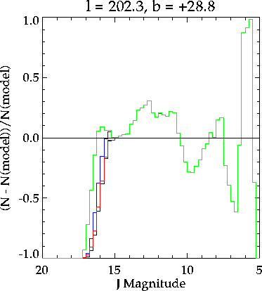 Four figures are shown for each position. The first of these is a plot of the fractional difference between the actual source counts and the SKY model as a function of magnitude bin for the J-band measurements. This figure (and the others for these fields) exclude sources in the lists which are flagged as extended sources (or contaminated by extended sources). We have limited this comparison to sources with signal-to-noise ratio (SNR) in the J band greater than 10, in order to avoid major deviations caused by flux overestimation at low SNR. For these plots, the black histogram (as opposed to the black zero deviation line) are those sources which have SNR > 10 in all three bands. The blue histogram are those sources for which the H band AND J band SNR are > 10, the red where Ks band AND J band have SNR > 10, and the green line are those sources for which the J band has SNR > 10.