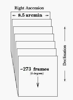 The camera field-of-view shifts by approximately one-sixth of a frame in declination from frame-to-frame. Figure 1 illustrates the relationship between individual camera frames and survey tiles. The camera images each point on the sky six times for a total integration time of 7.8 sec. The scan rate (and, thus, the frame-to-frame declination offset) and array orientation are set, so that each of the six apparitions of a given star occur at a different location relative to a pixel center. This sub-pixel "dithering" improves the ultimate spatial resolution of the final coadded Atlas Images relative to a single undersampled image taken with 2.0" pixels. Figure 2 compares a single survey frame with the final Atlas Image product.
