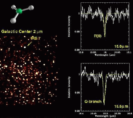 As a result of the Big Bang, the Universe is expanding. This causes spectral lines which would normally appear in the ultraviolet and visible part of the spectrum to be doppler shifted into the infrared for very distant objects. This means that infrared spectroscopy is a valuable tool for understanding conditions in the early Universe. An example of this can be seen in the spectrum of the most distant quasar currently known. The doppler shift of spectral lines also allows astronomers to detect and measure the velocity of planets around stars, stars around stars, expanding stellar atmospheres, outflows from star forming regions, rotating rings in galaxies, rotating spiral arms, supernova explosions, and shock waves from colliding galaxies. Infrared light is radiated from any object with a temperature. Even objects which are too cool to be detected optically can be studied in the infrared. For example, the ISO spectra (left) led to the discovery of a new molecule in interstellar space. The molecule, CH4, is one of the most important tracers for the formation of complex carbon-based molecules. It was detected in very cold and thin molecular clouds by its infrared absorption lines. The discovery of this molecule and the measurement of its abundance will lead to a better estimate of the abundance of hydrocarbons in space. To see some of the molecules which have already been discovered in interstellar space click here. |
