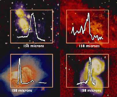 ISO spectra of S106, Cirrus, NGC7027 and the Antennae galaxies with detection at 158 microns of CII. |