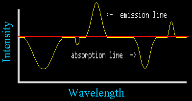 The shape of the continuous spectra (often refered to as the continuum) on a plot is dependent on temperature and motion of the emitting gas. In this simple plot it is shown as a flat line - in reality it is usually a curved line. Also, many of the real data plots you will see have the wavelength or frequency on a logarithmic scale. |