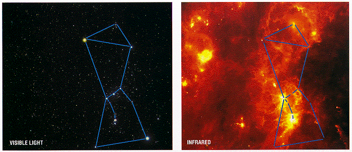 The contellation Orion as you go from a visible to an infrared view SIRTF - INFRARED PROCESSING AND ANALYSIS CENTER