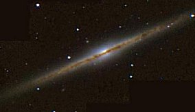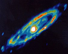 Below are infrared images of three galaxies. To the left is an infrared image, taken by the IRAS satellite, of the Andromeda galaxy. Notice the regions where young stars are forming shown in yellow and red. The middle image shows an infrared view of the barred spiral galaxy NGC 1365. In this image you can more clearly see the the bright areas of star formation, as well as young star clusters. Taken in 1999, this image shows the improvement in resolution since the days of IRAS (sixteen years earlier). To the right we have an infrared view of the edge on spiral galaxy NGC891. Here you can clearly see the lanes of dust along the edge of the galaxy.