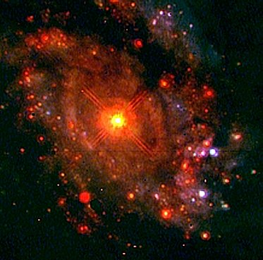 The brightest infrared galaxies are usually the ones which have a lot of dust (in star-forming regions for example). Astronomers using the IRAS satellite observed 20,000 galaxies in the infrared. Many of these were starburst galaxies - galaxies which are forming enormous numbers of new stars, and are thus extremely bright in the infrared. Further infrared studies of these galaxies may find the cause of this star-forming frenzy. At the left is an infrared image of the starburst galaxy M83. Spiral galaxies, which are rich in gas and dust, are strong infrared sources and are still forming new stars. About half of the luminosity of an average spiral galaxy is radiated at far-infrared wavelengths. Elliptical galaxies are faint in the infrared because they no longer have much gas and dust. |