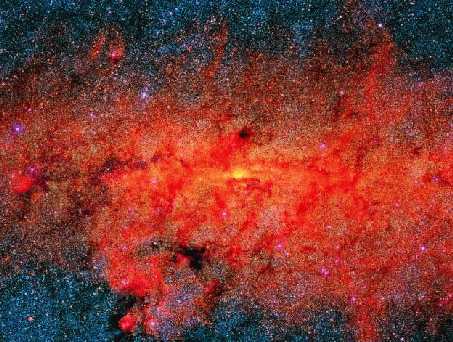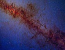 | The Milky Way is a spiral galaxy containing over 100 billion stars. It is over 100,000 light years (or 600,000,000,000,000,000 miles) in diameter and has a disk containing spiral arms and a dense central sphere or bulge. The center of our galaxy is not visible at optical wavelengths because it is hidden behind numerous clouds of gas and dust. However we can view the center of our galaxy in the infrared, since infrared rays can penetrate gas and dust. The image to the right is a combination of infrared data from the 2MASS and MSX projects. The Galactic plane runs horizontally along the image, and the Galactic center is the bright (yellow) object near the middle. In the blue regions (2MASS) many stars invisible to optical telescopes can be seen in the infrared. The red areas (MSX) show the distribution of dust near the center of our galaxy. |