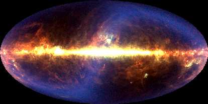| To the left is an infrared image of the entire sky from the COBE satellite. The bright band in the middle of the image is our Milky Way galaxy. This is how our galaxy appears from our vantage point in the sun's orbit about the center of our galaxy. Our solar system is located far out in the disk of our galaxy at a distance of about 30,000 light years from the center of our galaxy (that is about 1,760,000,000,000,000,000 miles). It is interesting to compare images of our galaxy at several different wavelengths . |