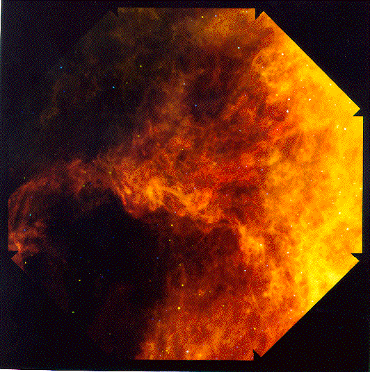 The infrared sky at the north celestial polar cap is displayed in this image constructed from nine fields of the Infrared Astronomical Satellite (IRAS) Sky Survey Atlas. The image is a composite of 12 micron (coded blue), 60 micron (green), and 100 micron (red) wavelengths. The stars are the warmest features in the picture, and show up as small blue dots, since they radiate brightly in the 12 micron wavelength. The yellow dots are galaxies, which shine brightest in the 60 micron and 100 micron wavelengths.