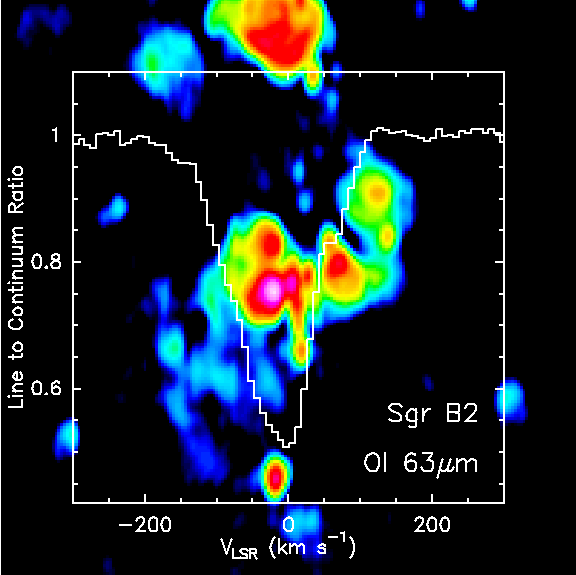 The OI 63 micron absorption line overlaid on an 8.4 GHz VLA image of Sgr B2 showing a 4.4 x 4.4 pc field centered on the luminous FIR source Sgr B2 M. The width of the box (80") is the FWHM diameter of the ISO LWS beam; the spectral resolution of the LWS FP at 63 microns is 37 km/s.