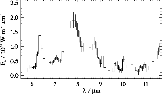 This spectrum shows the spectral energy distribution of the starburst galaxy NGC 6090 in the infra-red. The spectrum was taken using ISOPHOT-S in the region between 5.8 and 11.6 microns.
