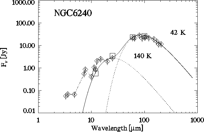 Observations using all 25 ISOPHOT-P and -C filters giving the shape of the 3 to 240 µm Spectral Energy Distribution of NGC 6240. The squares represent the four photometric IRAS points.