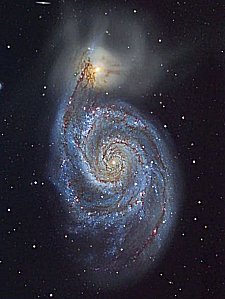 The Whirlpool Galaxy (Messier 51) is a face-on spiral galaxy gravitationally interacting with a smaller companion galaxy. It is about 37 million light years away from the Earth.