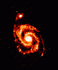 The X-ray image highlights the energetic central regions of the two interacting galaxies. Much of the diffuse glow is from multi-million degree gas. Many of the point-like sources in the x-ray image are black holes and neutron stars in binary star systems. Visible light clearly reveals the sweeping spiral arms and the fact that the arms include patchy knots of star formation. The companion galaxy, which is classified as an irregular galaxy, lacks the well-defined structure of a spiral galaxy and appears "attached" to the end of a spiral arm in the "Whirlpool Galaxy". Infrared is well-suited to studying star formation and tracing dust in spiral galaxies. The infrared image not only shows the galaxy cores and spiral arms, but nicely illustrates the knots of star formation occurring in the arms. The spiral arms extending from the galaxy center and the companion galaxy are clearly seen at radio wavelengths. A modest-sized red blob appears to be connected to the end of the southern spiral arm, located about the 8 o'clock position. This is probably a background quasar. For additional images of Messier 51 at various wavelengths, visit our Multiwavelength Gallery.
