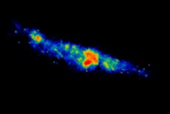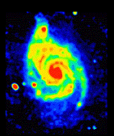 The ultraviolet picture shows the strange nature of M82. The peculiar shape