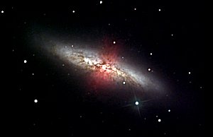 regions of the galaxy. The reddish hue near the center of M82 is created