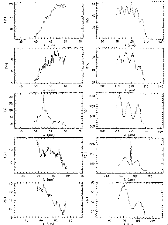 SW1 LW1 SW2 LW2 SW3 LW3 SW4 LW4 SW5 LW5This source has a strong continuum and the zero point is off the plot on the (unreadable) y-axis of these plots, with only the top 20% or 30% of the emission plotted. The [OI] 63 um line can be see on a ripple peak in SW3 while the [CII] 158 um line is in a trough in LW4.