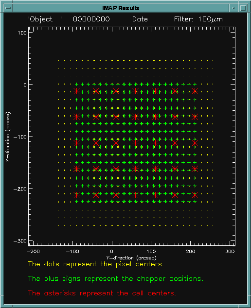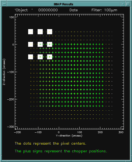For both diagrams above, the +Y is to the right and +Z is upwards.DISPLAY Displays the individual pixel centers with yellow dots, and the detector centers at each chopper plateau with green plus signs. Above the plot, the name of the object, TDT number, date of observation, and wavelength of the filter used are given. The gray square boxes represent the individual detector pixels for the top left most chopper plateau. These boxes are correctly centered at the pixel centers. However, these are NOT drawn to scale, and the aspect ratio of the display is not correct; this is simply to aid the user with the visualization.
