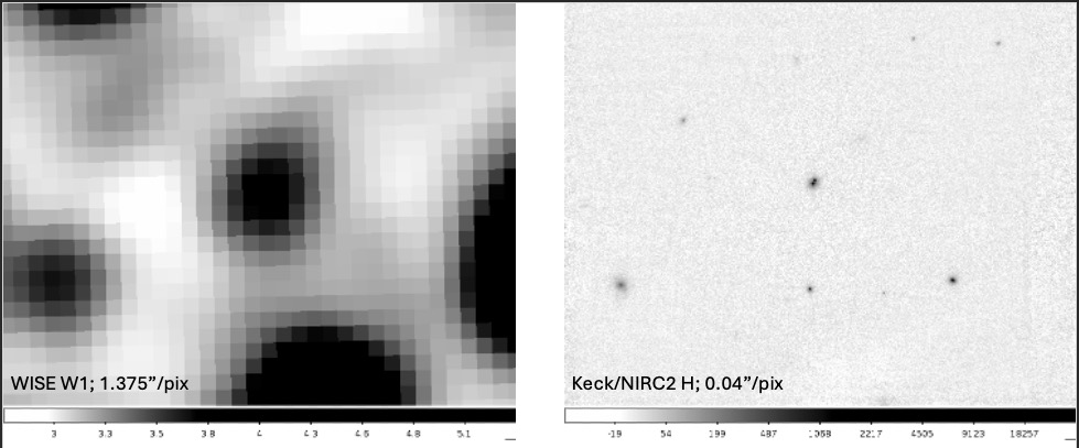 WISE/NEOWISE scanned the entire sky multiple times and was very good at discovering brown dwarfs. However, to be efficient at these observations, the WISE pixels needed to cover a relatively large area of the sky. This meant that the light from many objects could blend to appear as a single object. When we found new brown dwarfs in WISE/NEOWISE data, the images would make it appear that the brown dwarf was a single object (left image). Often, it actually was a single brown dwarf. But for about 10%−20% of the discovered brown dwarfs, high resolution images like those with the NIRC2 instrument on the W.M. Keck Telescope (right image) would show that the brown dwarf was really two brown dwarfs! These binaries are crucial for our understanding of brown dwarfs because they allow us to eventually measure the masses of these objects, something that is not possible for single brown dwarfs.