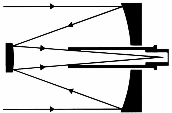This is a diagram of a typical Cassegrain telescope. Notice how the light enters from the left and is reflected by the primary (concave) mirror to the secondary (convex) mirror. The secondary mirror then redirects and focuses the light. The focal point is at the end of the telescope. |